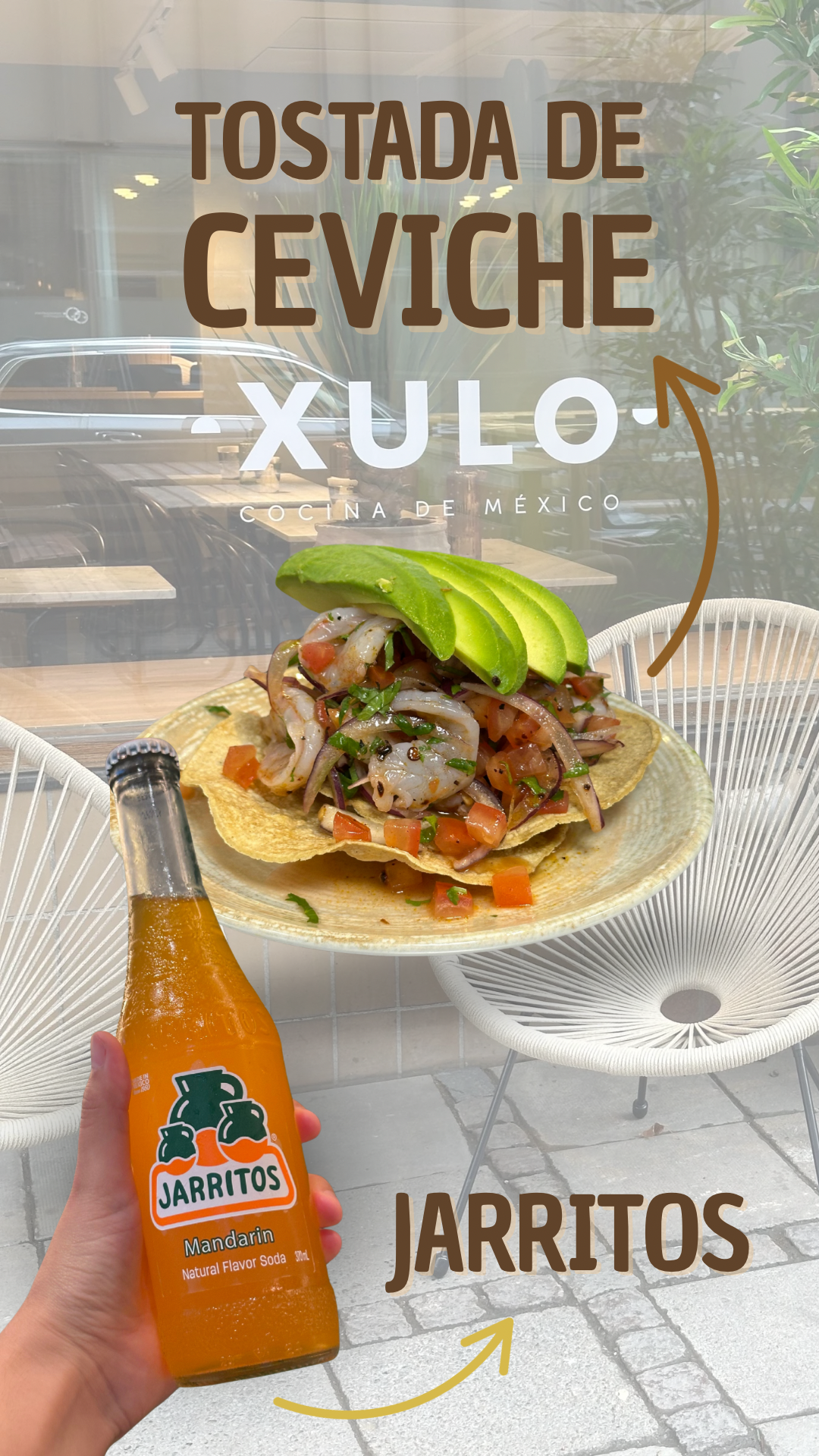 Mazatlan style: räkor som marinerats i lime blandat med färska tomater, avokado, hackad lök och koriander. Ceviche serveras med totopos (egengjorda nachos). En ceviche är stor som en huvudrätt eller som en stor förrätt för 2 personer.