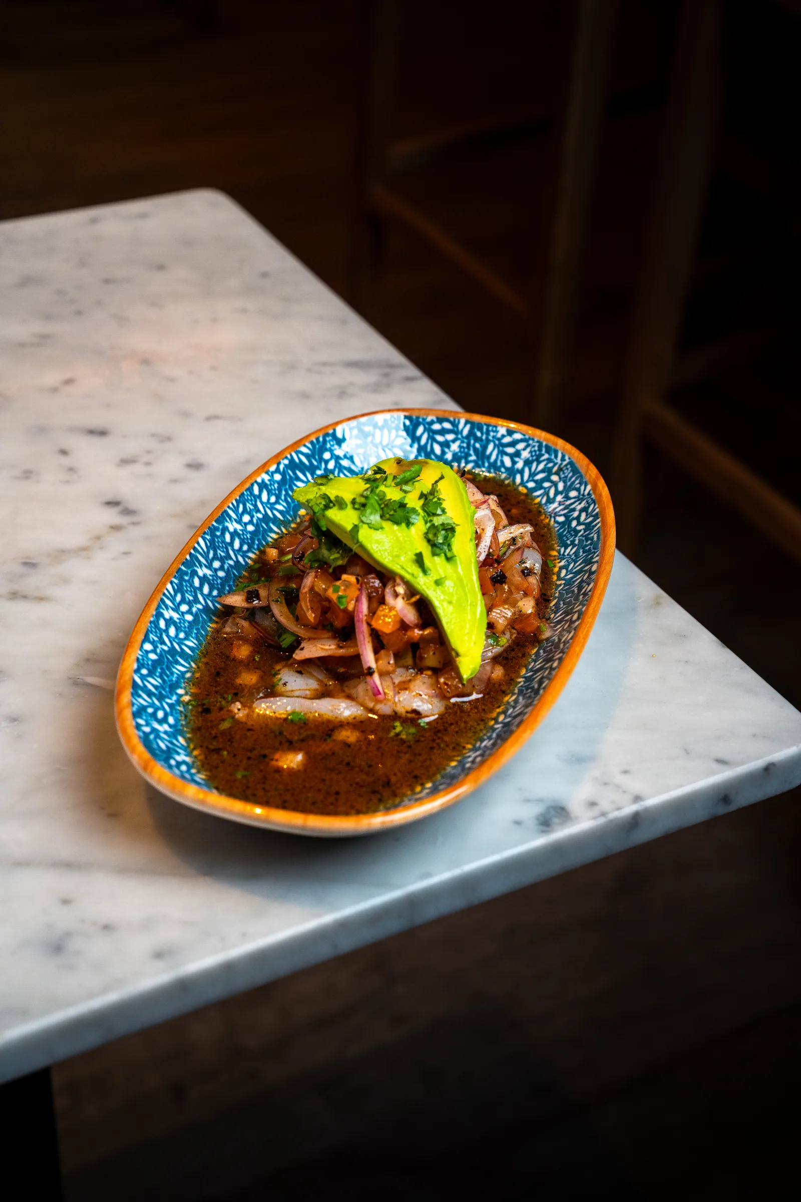 Liten 165 kr / Stor 290 kr. Räkor i rökig svart chilisalsa av torkade chilisorter, med avokado, lök och tomat.